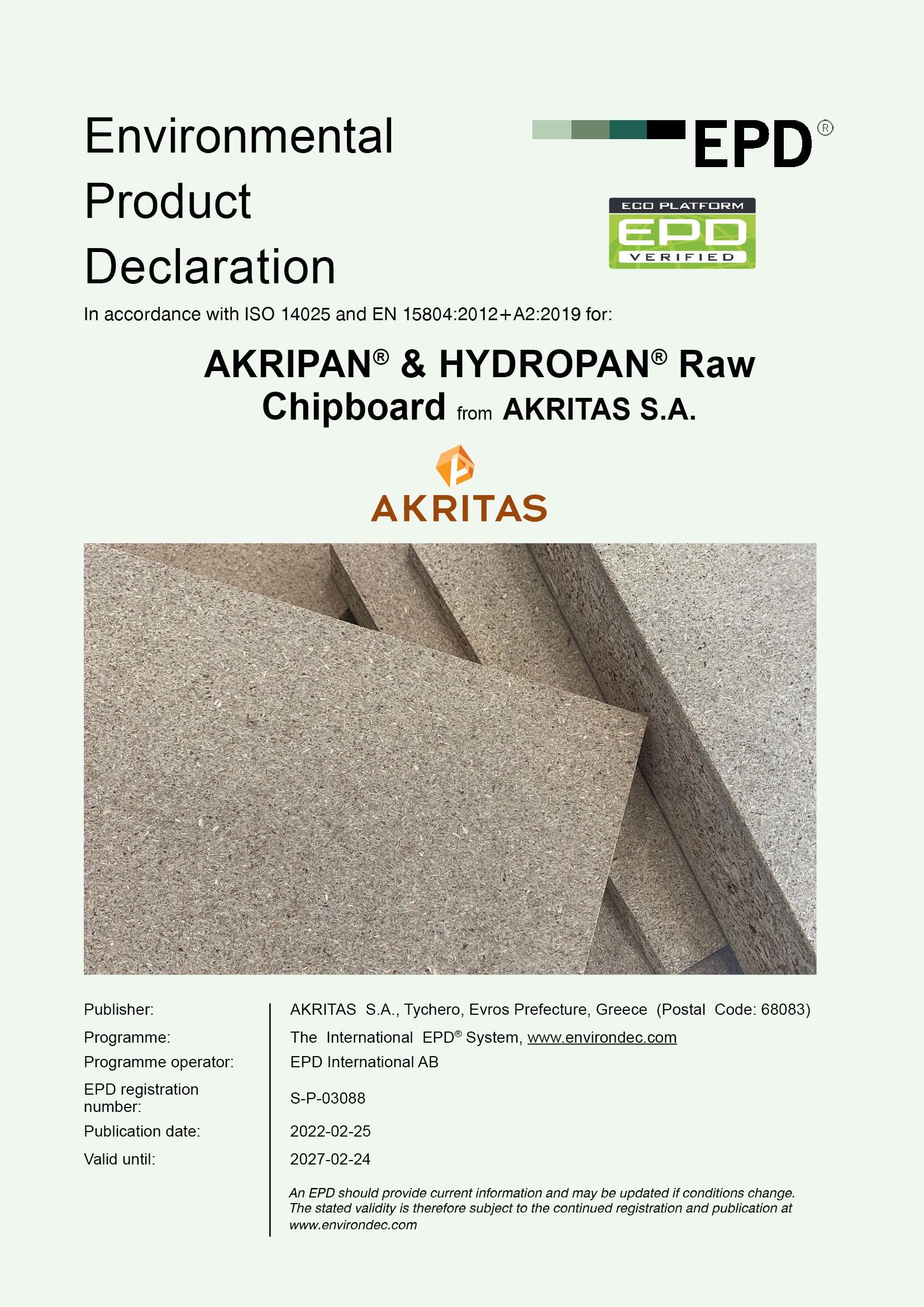 Environmental Product Declaration (EPD) is available for AKRIPAN®, HYDROPAN® waterproof chipboard and AKRITAS melamine faced chipboards.